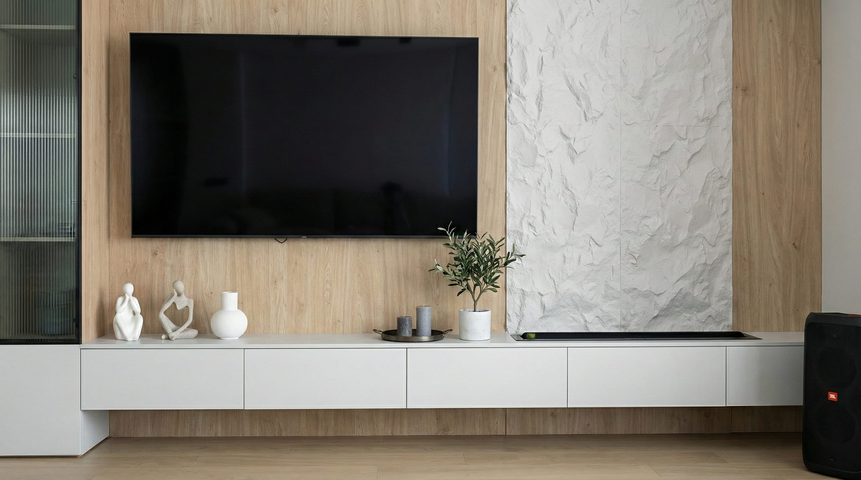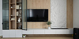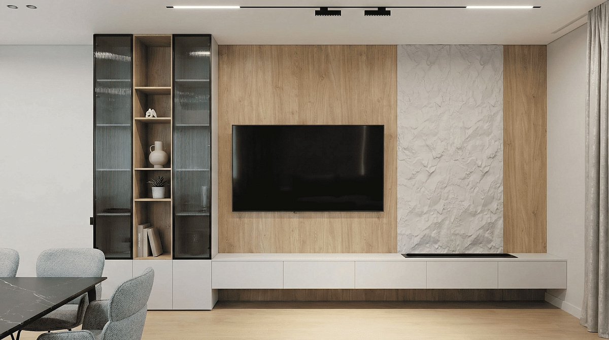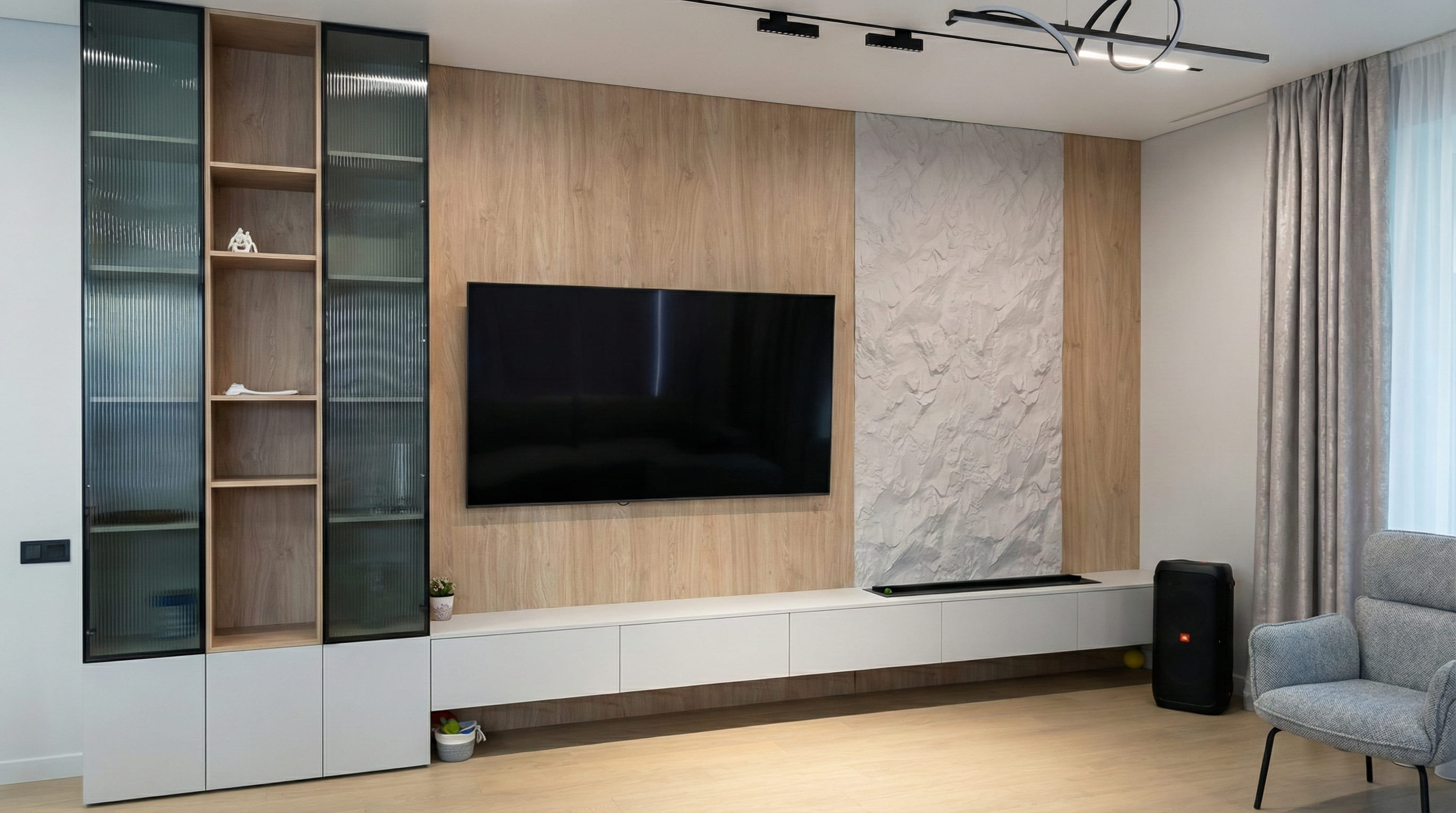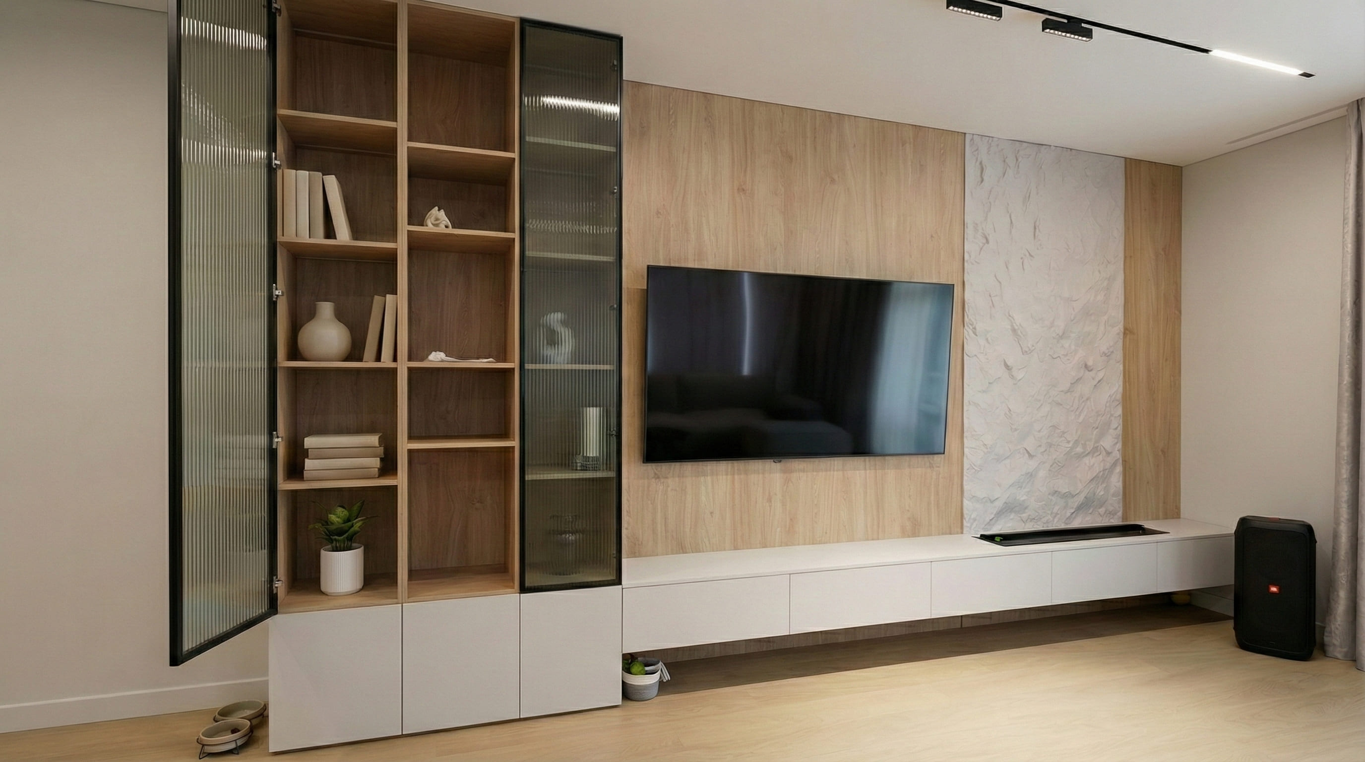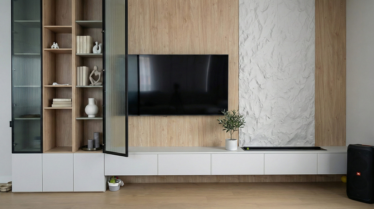 Парящая консоль и витринные блоки выстраиваются в единую горизонталь без разрывов. Древесная плоскость создаёт тёплый фон, фактурный вертикальный блок добавляет глубину — взгляд цепляется за текстуру, но не устаёт от деталей. Витрины с каннелюрами и рифлёным стеклом фильтруют свет, подчёркивают вертикали и держат ощущение порядка даже при активной жизни дома.