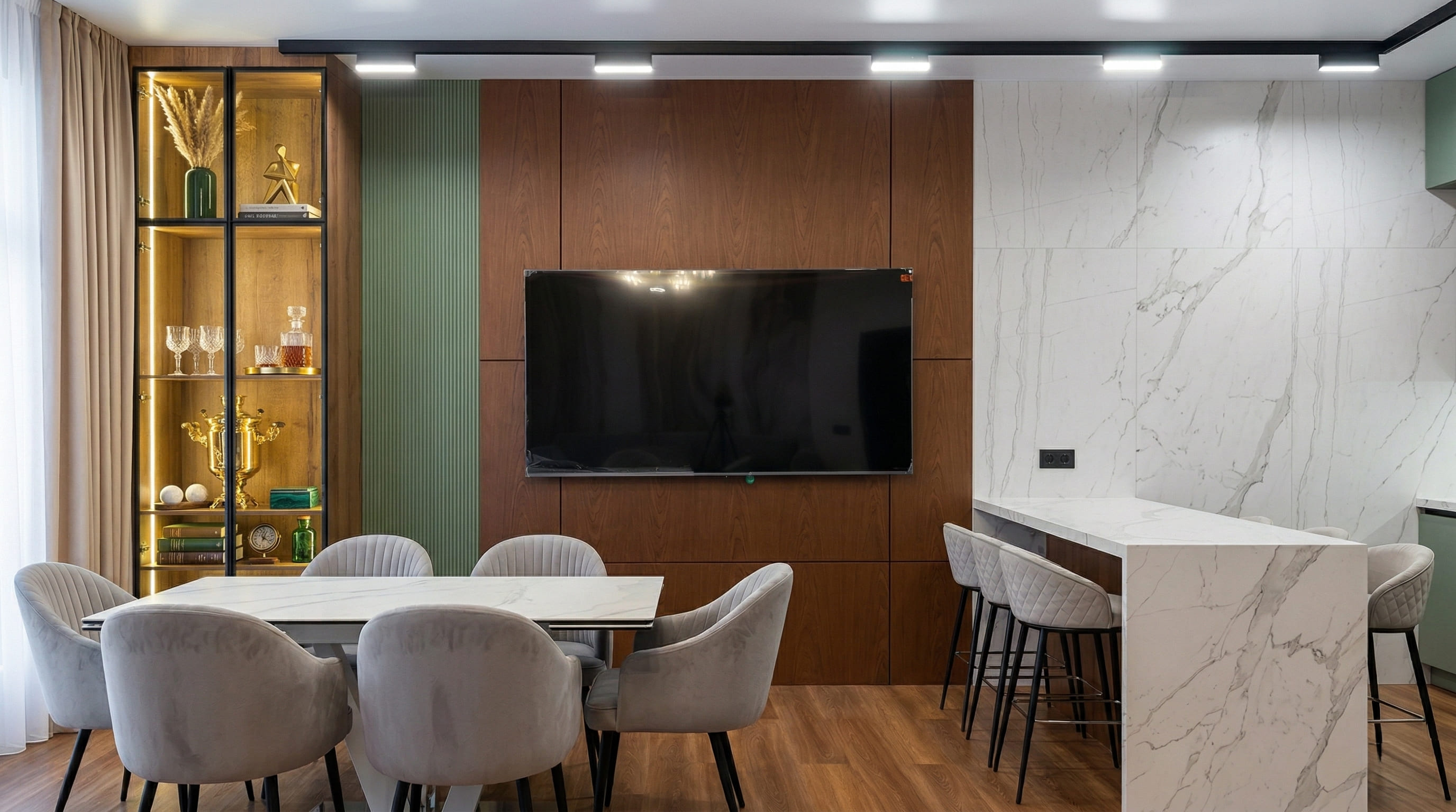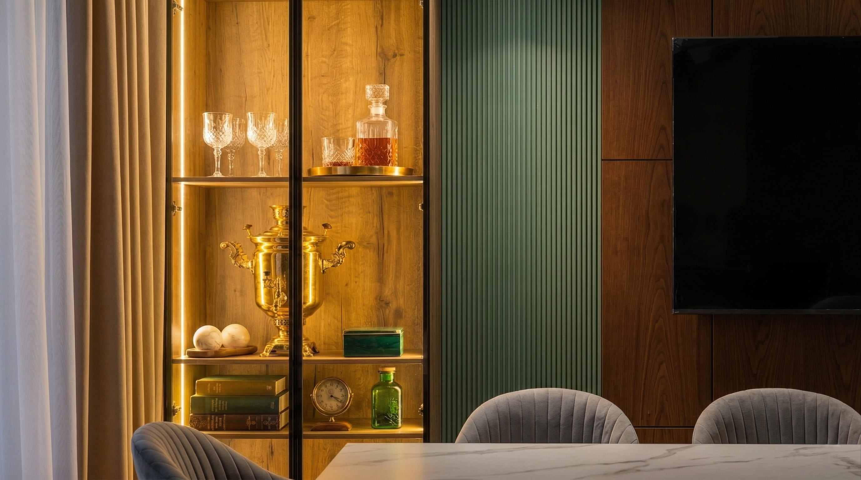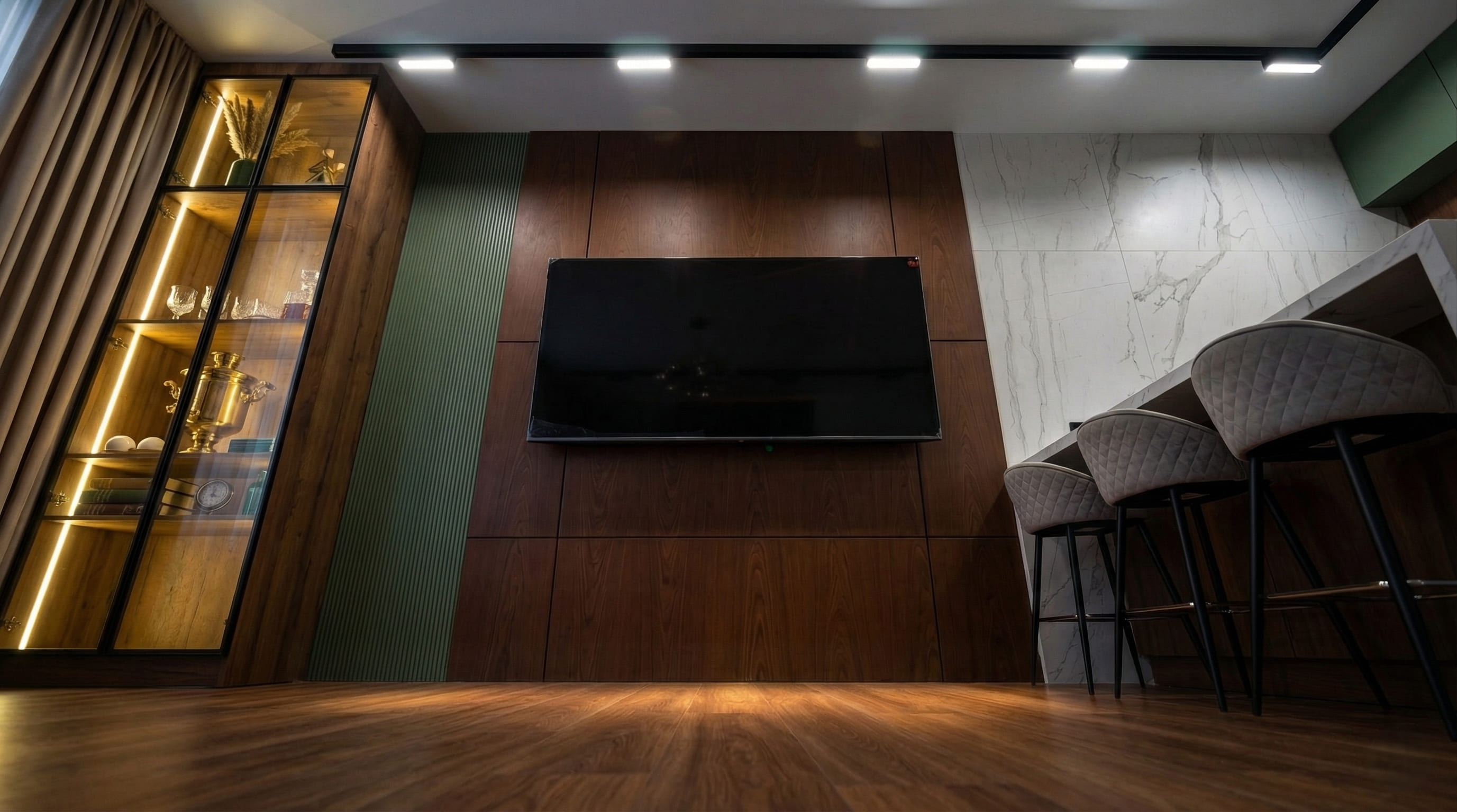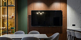 [~VALUE] => VERDE WALL / Встроенная TV-зона со стеновыми панелями и витриной, контемпорари + арт-деко