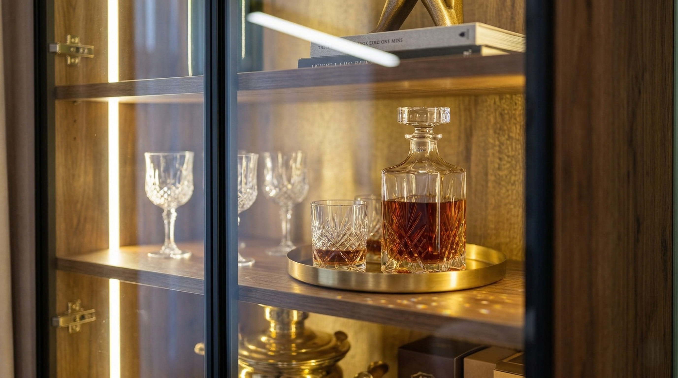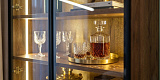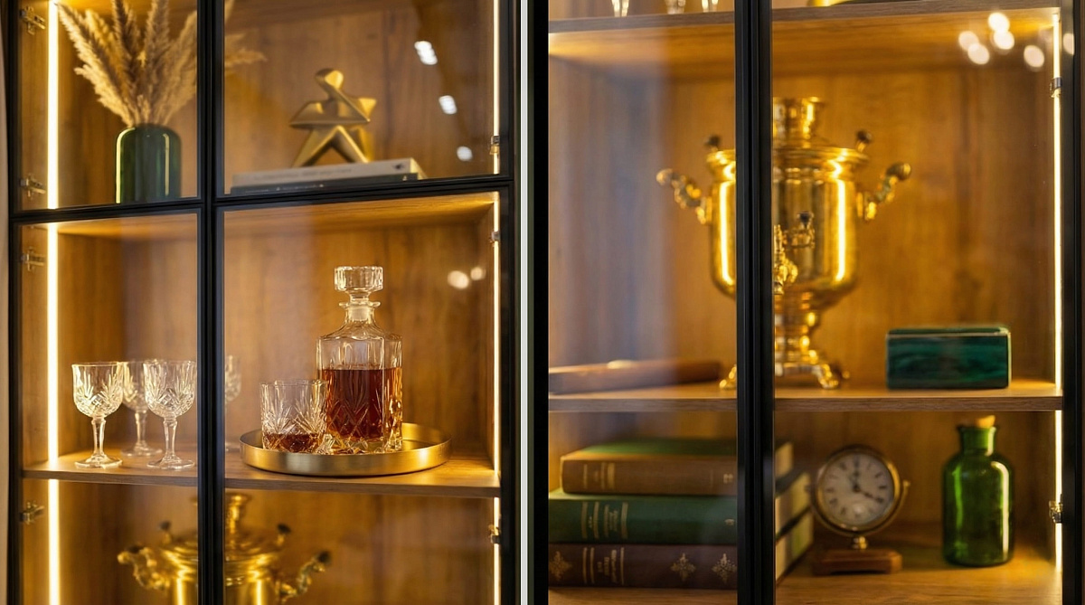 Витринные секции изнутри отделаны светлым декором «дуб натуральный»: при включённой LED-подсветке 2700 К они создают эффект тлеющего фонаря за стеклом. Кабели уходят внутрь скрытого каркаса без штробления, техника получает вентиляционный зазор. Петли Hettich Sensys с демпфером Silent System закрывают стеклянные дверцы мягко и бесшумно. Кромка на PUR-клее — не вздуется и не отслоится за весь срок службы.