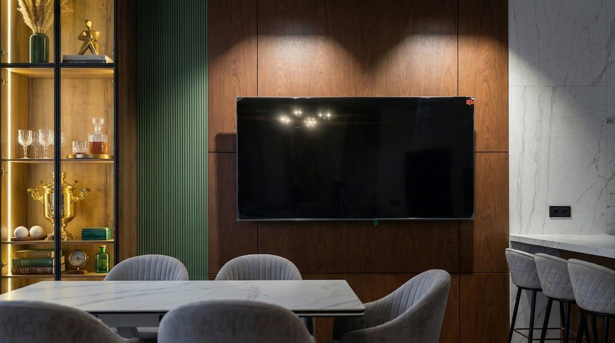 [VALUE] => VERDE WALL / Встроенная TV-зона со стеновыми панелями и витриной, контемпорари + арт-деко